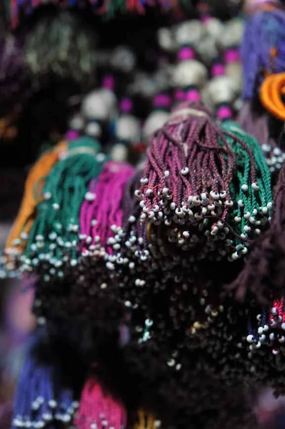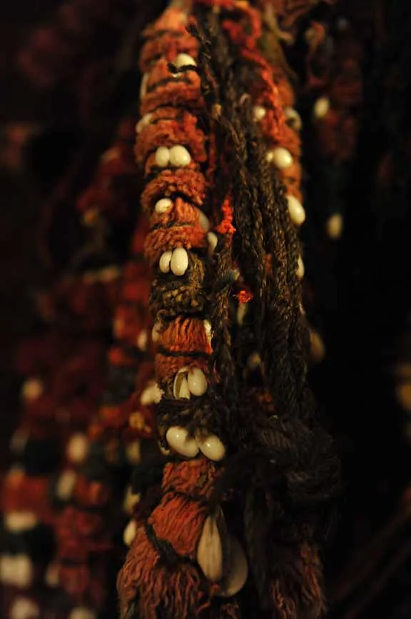 Intricate wool tassels hand tied with tiny shells.