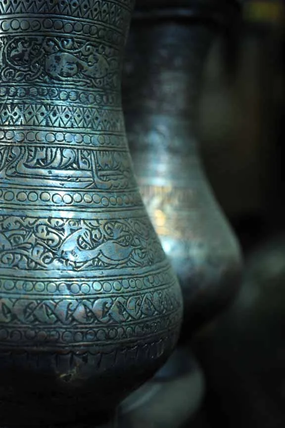 Metal vessels etched with birds and deer by hand.