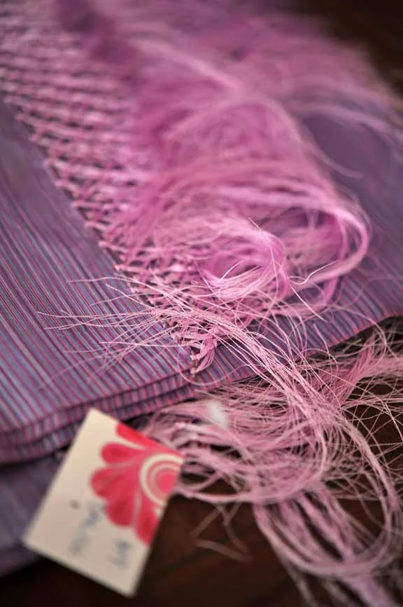 Hand woven scarves with long fringe.