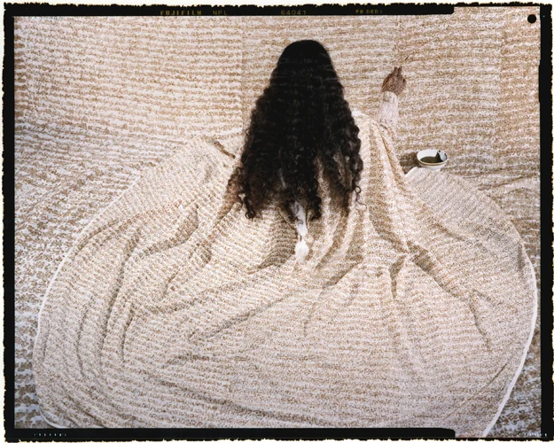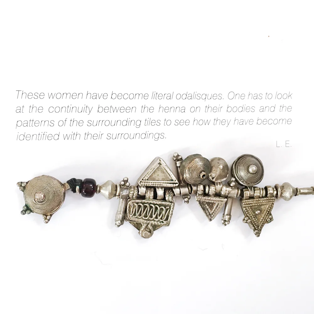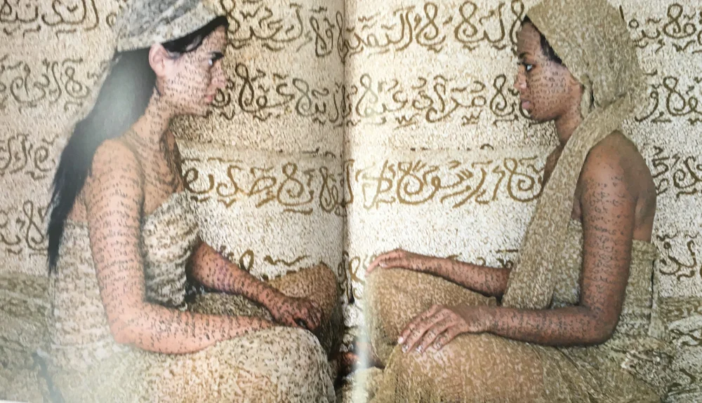 Essaydi's work is iconic in its novel use of henna and Arabic calligraphy. She writes in her new book, Crossing Boundaries Bridging Cultures, that "In employing calligraphic writing, I am practicing a sacred Islamic art that is usually inaccessible to women. To apply this writing in henna, an adornment worn and applied only by women adds a further subversive twist. "
